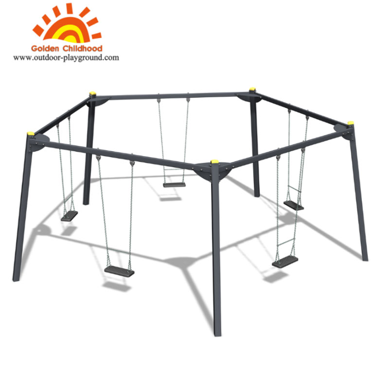 Наши уличные групповые качели имеют шестигранную конструкцию, позволяющую одновременно размещать 6 детей, что усиливает взаимодействие и привлекательность площадки.